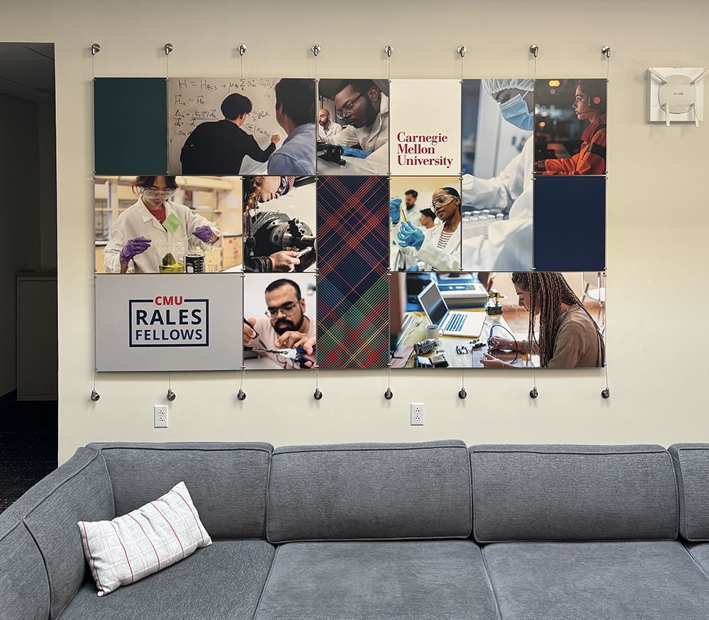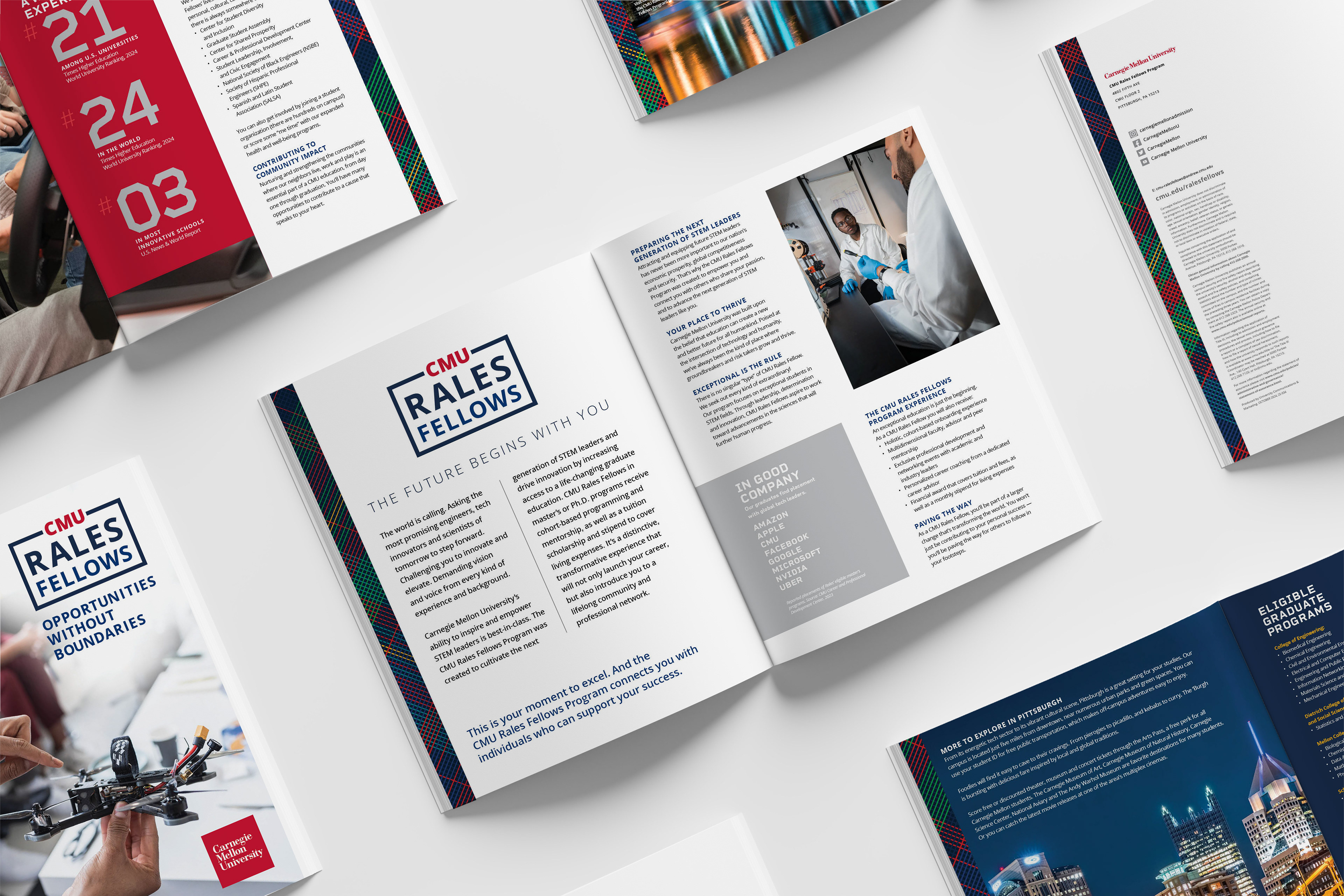 The main design element that carries through the pieces is a colorful tartan pattern. The founder of the university came from Scottish roots and each family has a tartan. The tartan is a pattern made up of many threads coming together to create a beautiful fabric. The fabric is made up of different colored threads—much like the students from different backgrounds and disciplines coming together at Carnegie Mellon University.